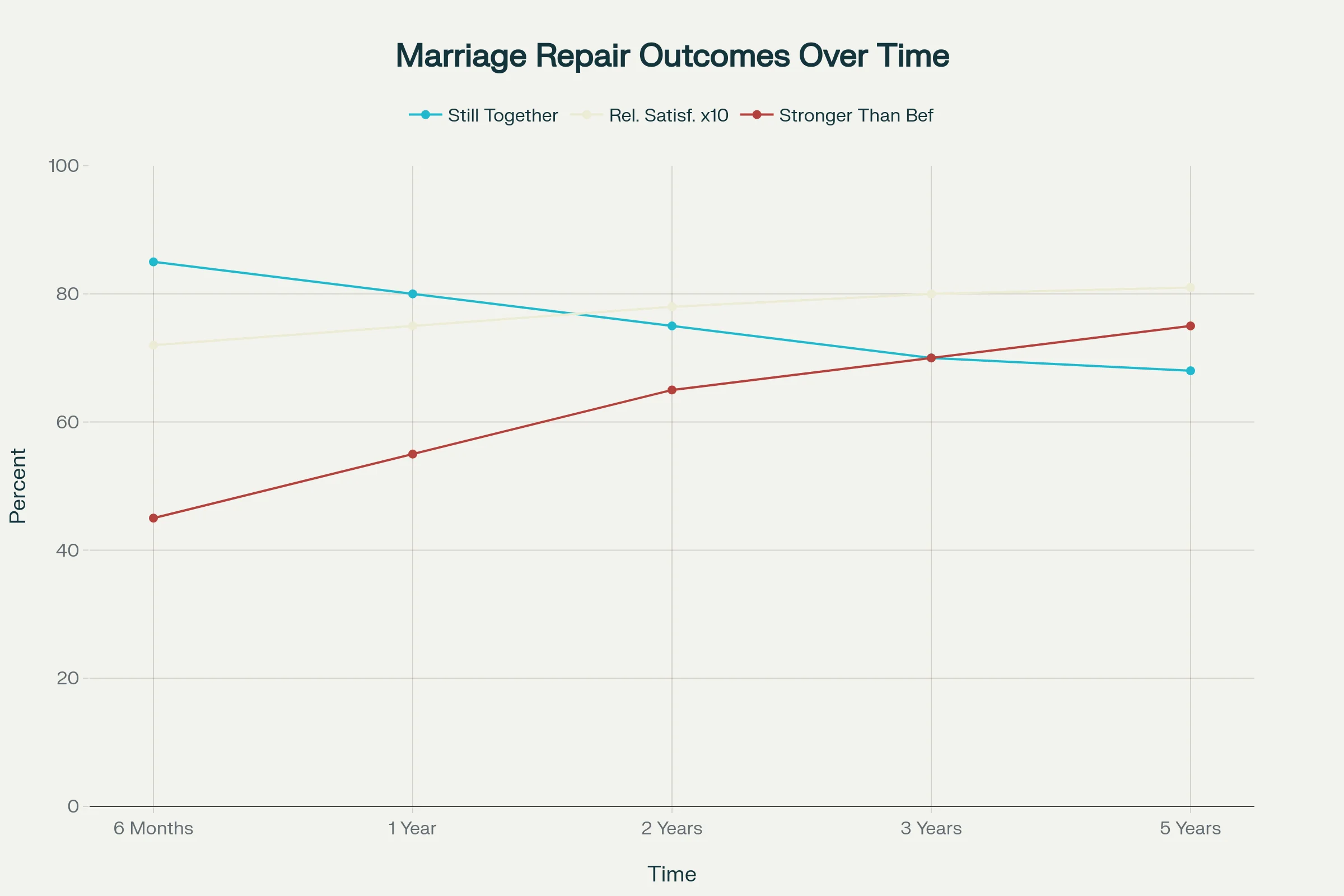 75% of couples who complete repair report their marriage is stronger than before by the five-year mark. This post-traumatic growth phenomenon shows that overcoming crisis together can actually strengthen the relationship foundation.