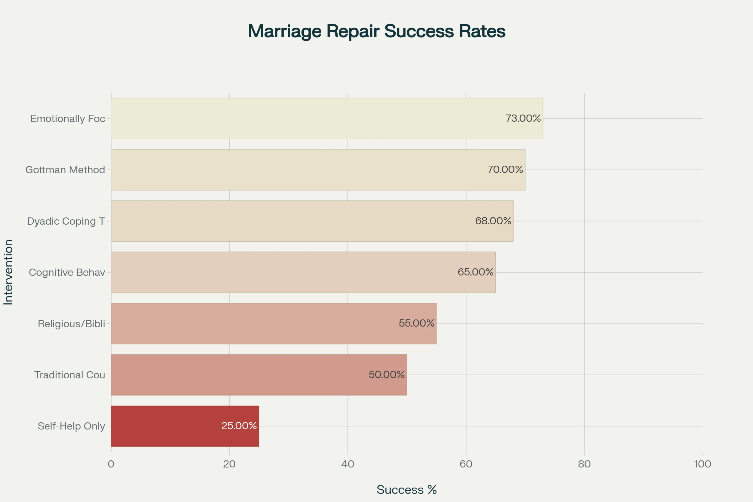 Different approaches to marriage repair show dramatically varying success rates, with evidence-based therapies significantly outperforming traditional methods.