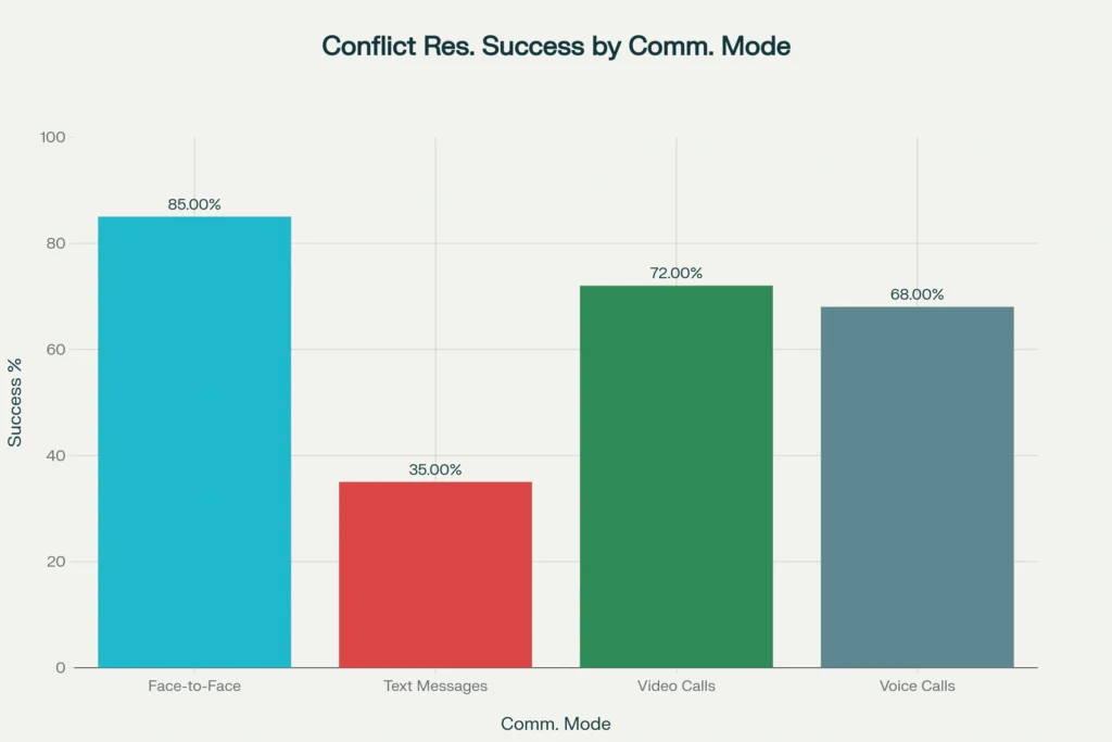 Face-to-face communication achieves an 85% success rate for conflict resolution, dramatically outperforming all digital alternatives. This superior performance stems from the availability of complete communication channels including vocal tone, facial expressions, body language, and immediate feedback loops.