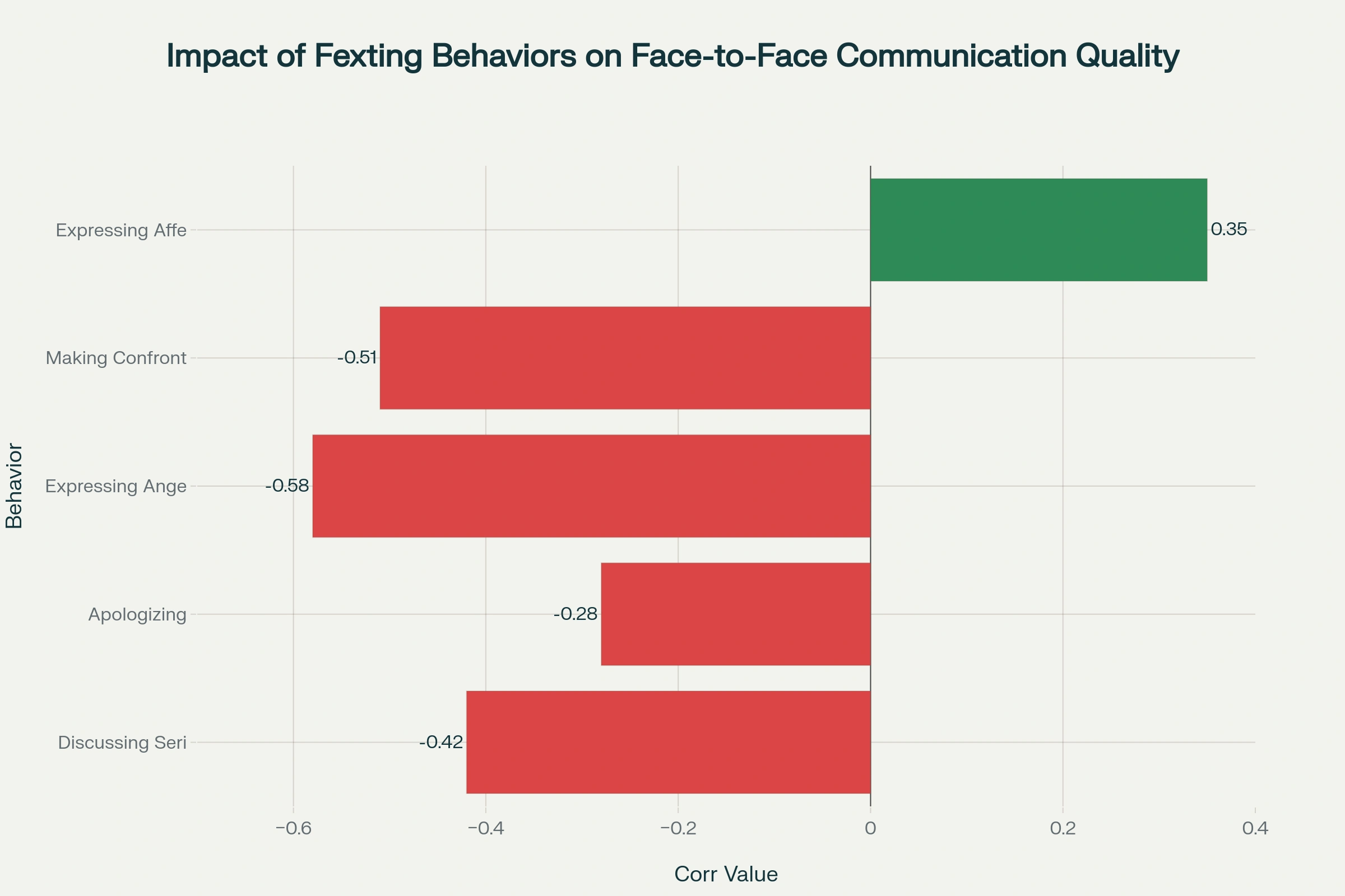 Relationship Damage: Every category of serious text-based conflict behavior shows negative correlations with relationship quality and face-to-face communication effectiveness.