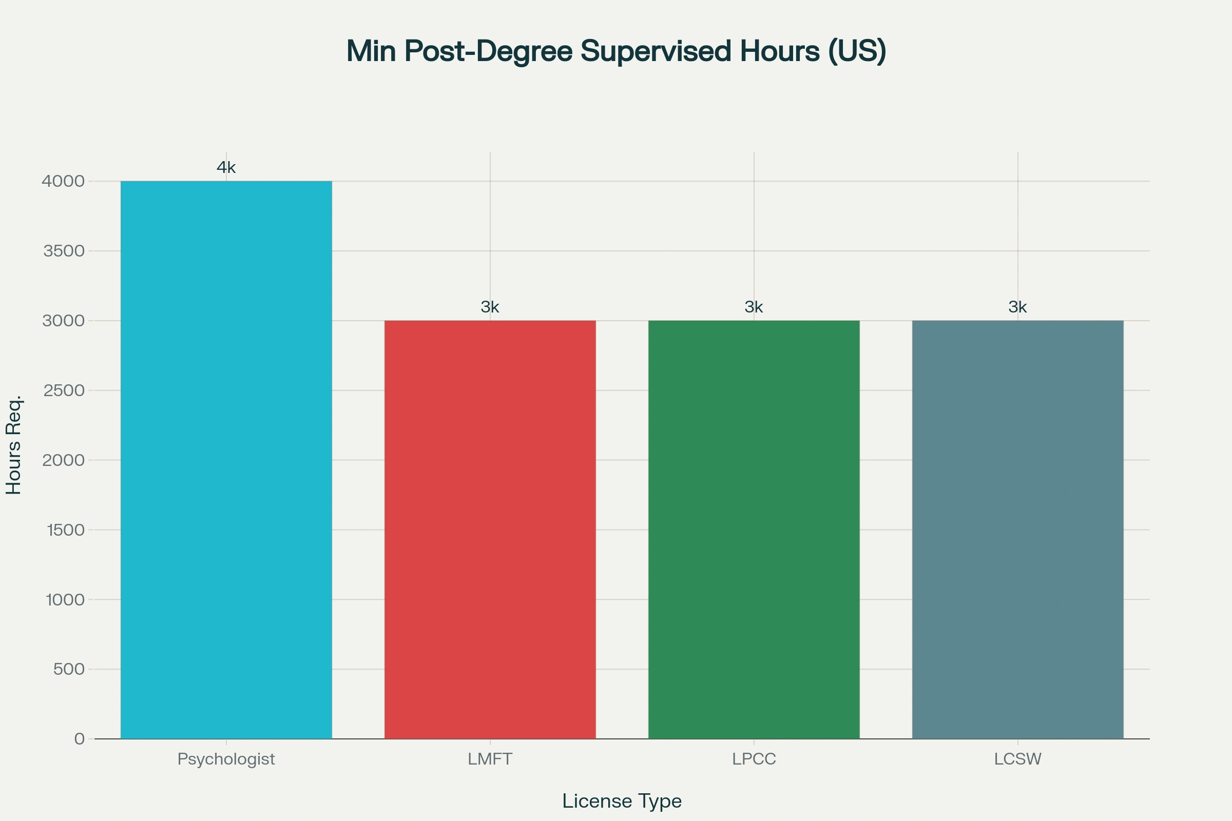| License | Supervised Hours (Post-grad) | Core Training Focus | Typical Strengths | Common Limits | Median Fee (US) |
