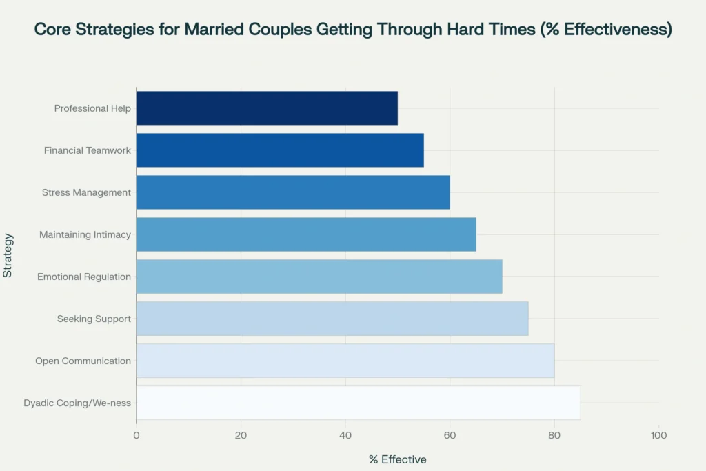 The most effective approach for couples facing hardship is dyadic coping: partners working together as a unified team to address stressors. This collaborative approach shows high effectiveness in helping couples maintain relationship satisfaction during difficult times.