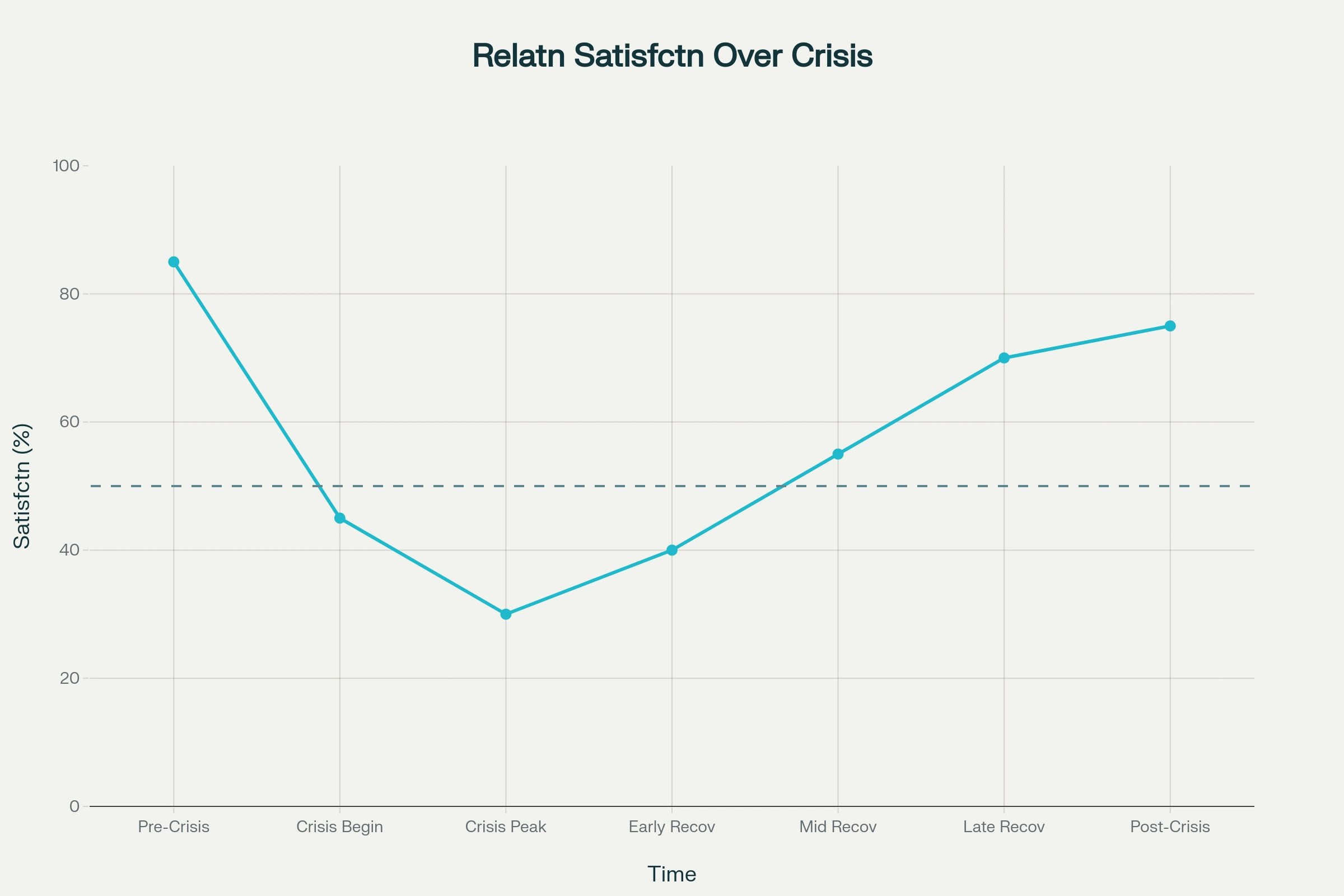 Studies show a typical U-shaped recovery in satisfaction from pre-crisis baseline, down through a low point, and back to a stable post-crisis level within 12–18 months for couples who persist and use effective strategies.