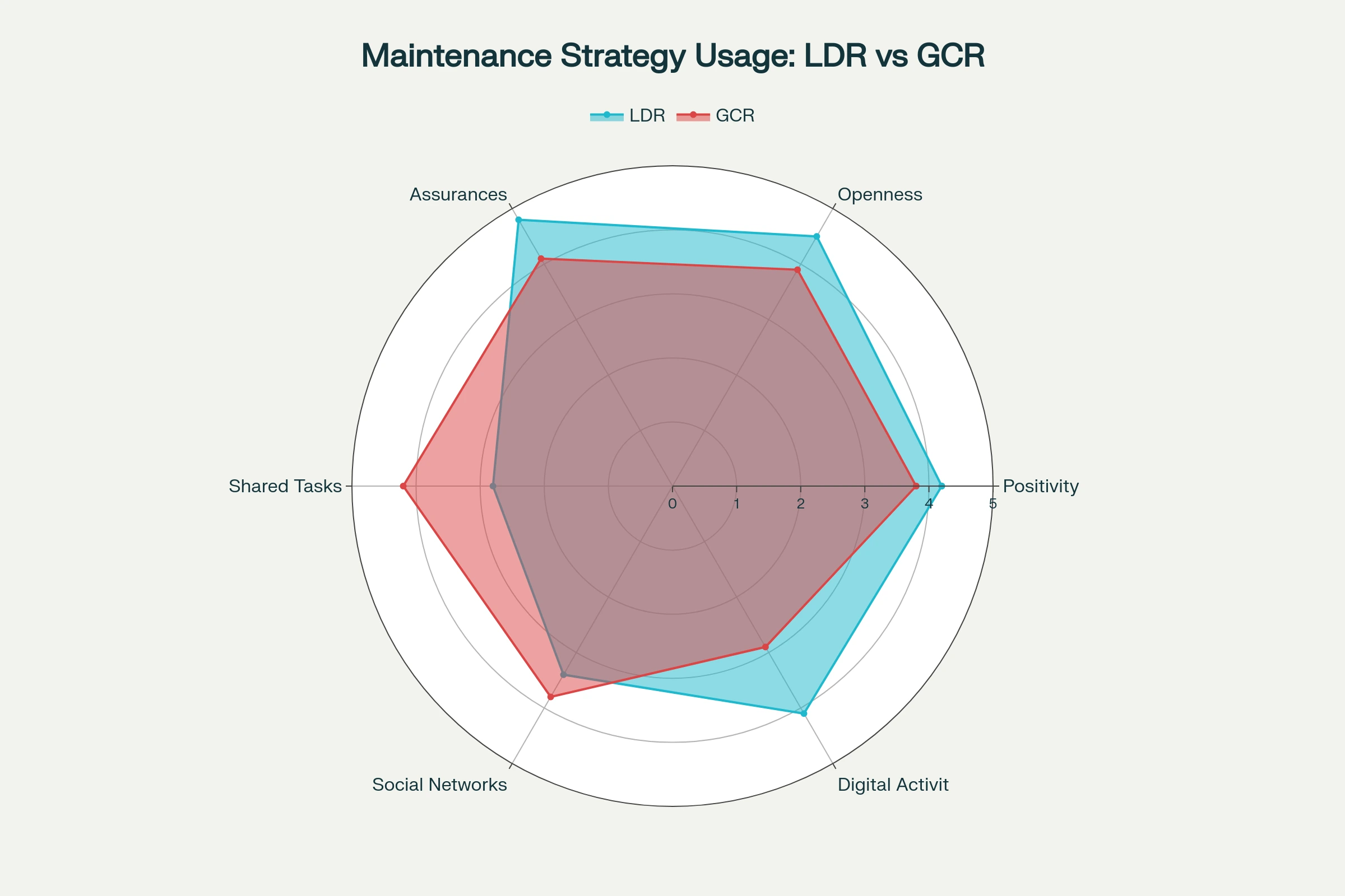 These patterns reveal that LDR couples must rely more heavily on verbal and digital relationship maintenance since they cannot access the practical cooperation and shared social networks available to GCR couples.