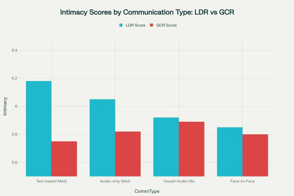 This counterintuitive pattern shows that LDR couples derive more intimacy from text-based communication than GCR couples derive from face-to-face interaction.