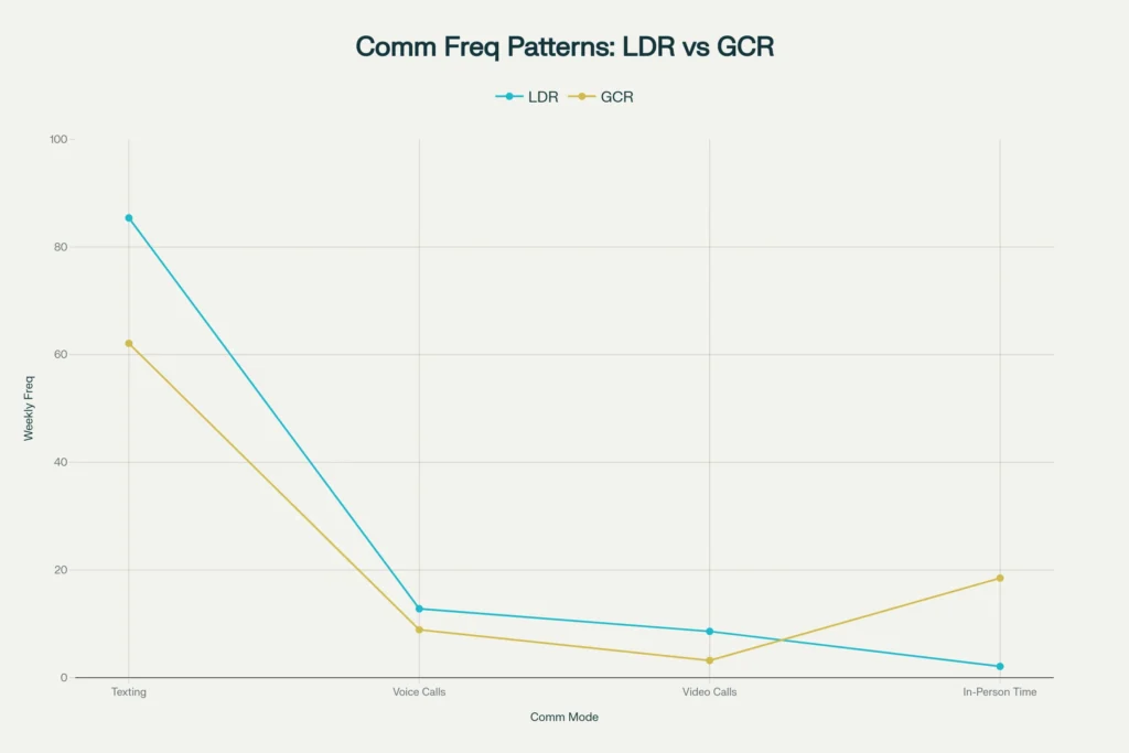 Texting: LDR couples average 85.4 messages weekly compared to 62.1 for GCR couples (37.6% increase). This frequent texting shows strong correlation with satisfaction (r = 0.20) for LDR couples but no correlation (r = 0.02) for GCR couples.