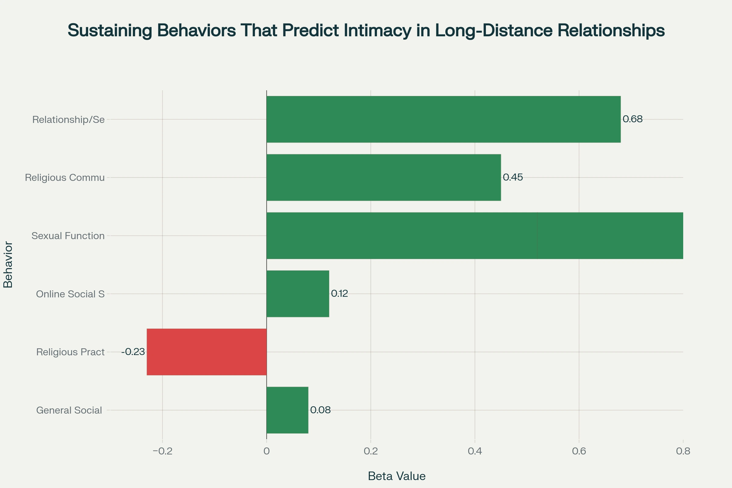 Religious Practice alone shows negative associations with both intimacy (β = -0.23) and satisfaction (β = -0.28). This counterintuitive finding suggests that rigid religious observance without accompanying communication may actually hinder relationship flexibility needed for LDR success.