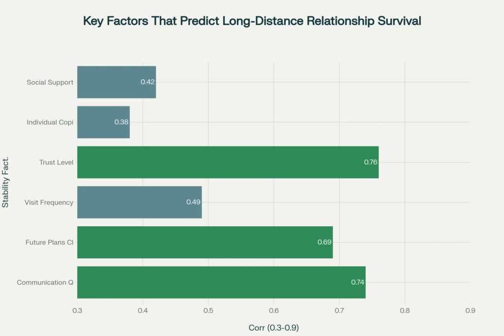 Trust Level: r = 0.81 correlation with survival, r = 0.78 with intimacy maintenance, r = 0.76 with satisfaction. Trust emerges as the single most important factor for LDR success across all outcome measures.