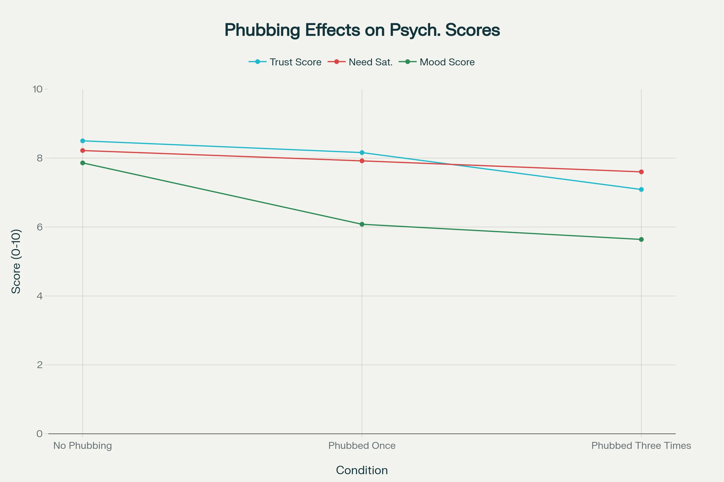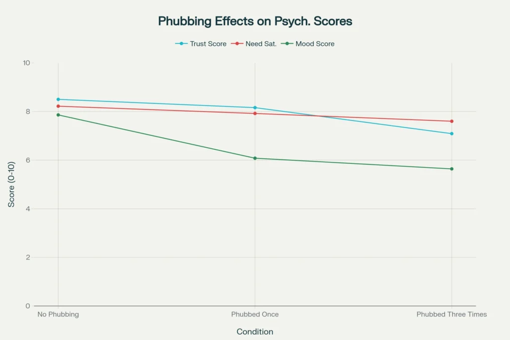 Lab studies show that phubbing’s effects are measurable. Trust scores dropped from 8.5 (no phubbing) to 8.16 (phubbed once) and down to 7.09 (phubbed three times) in a ten-minute conversation.