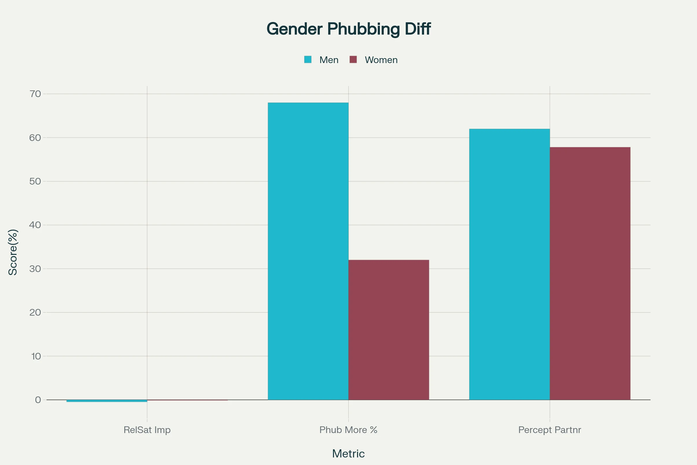 Men are more affected when phubbed by women, with a correlation of -0.47 compared to women’s -0.12. Men are also 68% more likely to phub than women, who make up 32% of phubbers. Men report higher awareness of being phubbed, scoring 3.10 out of 5 compared to women’s 2.89.