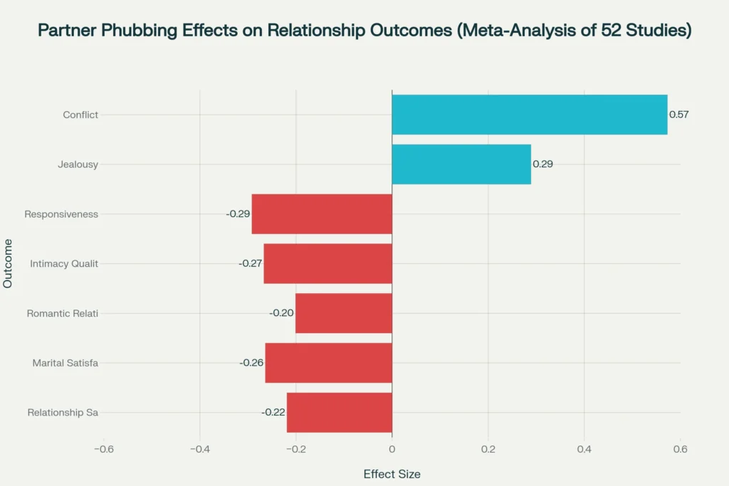 Across 30 studies with 9,040 people, partner phubbing shows a clear negative link to relationship satisfaction (r = -0.219). The effect is stronger in marriages (r = -0.264), suggesting it hits committed relationships harder.