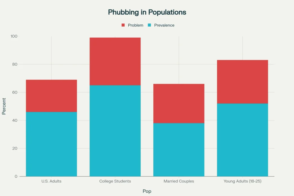 Research shows phubbing is now a common behaviour with serious consequences. Among college students, 65% report experiencing it. For young adults aged 18 to 25, 52% regularly encounter this behaviour from their partners. Even among married couples, 38% experience phubbing, with 28% saying it is a significant problem.