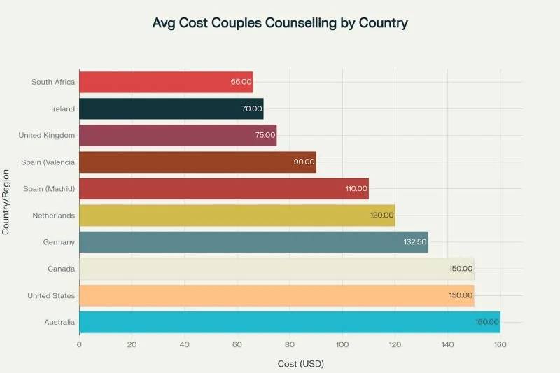 Couples counselling costs vary dramatically across countries, reflecting local economic conditions, healthcare systems, and market maturity. Australia leads in costs at $160 USD per session, followed closely by the United States and Canada at $150 USD per session. European markets show more moderate pricing, with Germany averaging $132.50 USD and the Netherlands at $120 USD per session. South Africa represents the most affordable option at $66 USD per session, demonstrating the significant global cost divide.