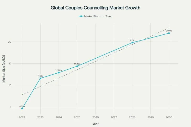 The couples counselling sector is experiencing unprecedented growth, driven by increased mental health awareness and reduced stigma around seeking relationship support. The global market is projected to grow from $11.6 billion in 2023 to $19.79 billion by 2028, representing a robust 11.3% compound annual growth rate.