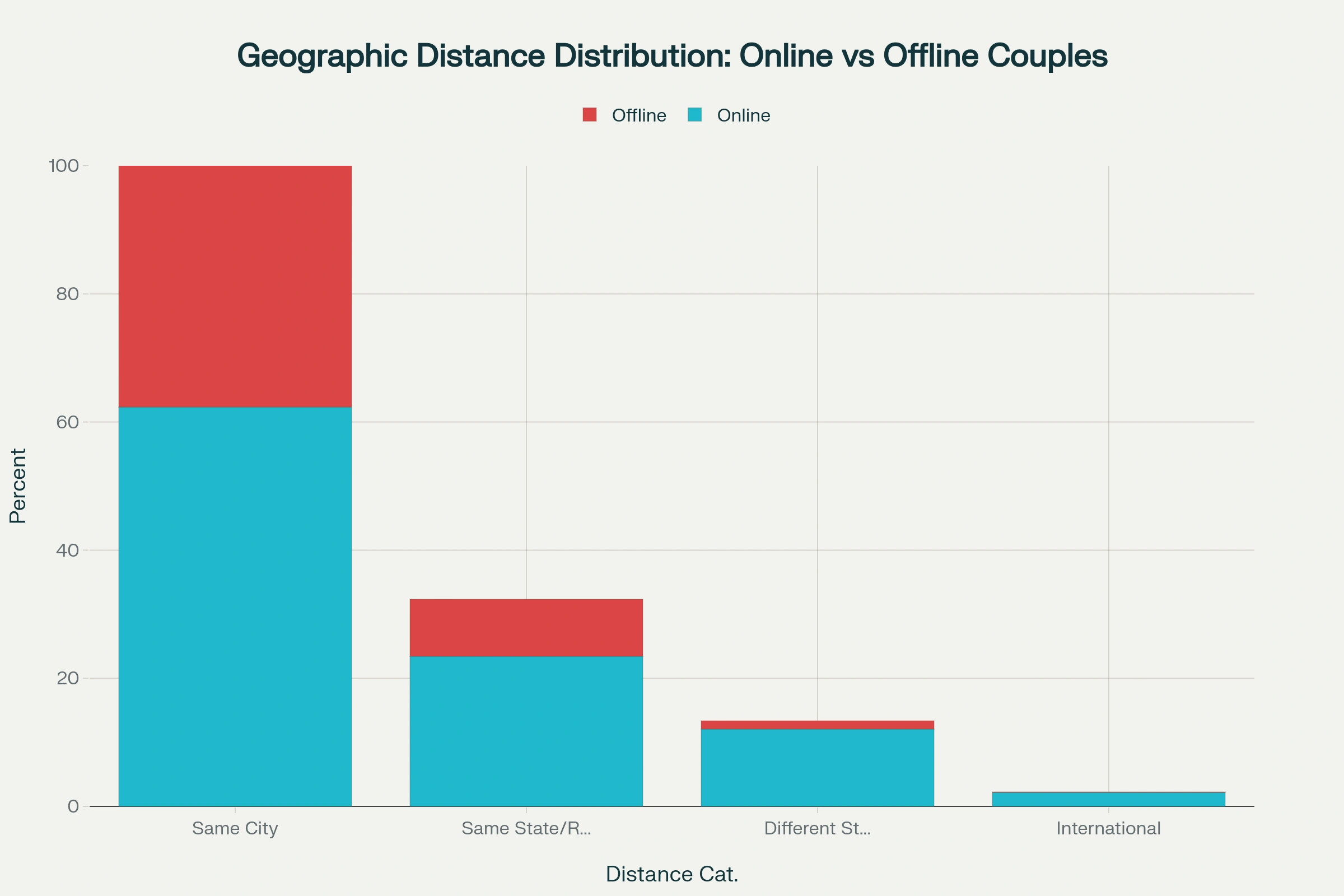 Geographic distribution analysis reveals a fundamental difference in how online and offline couples are spatially organised, with significant implications for relationship dynamics.