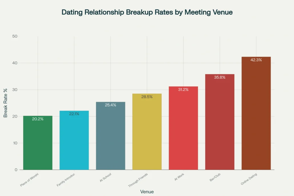 Social integration: Venues involving shared social networks (friends, family, worship, school) show consistently lower breakup rates, suggesting that community support and accountability enhance relationship stability.