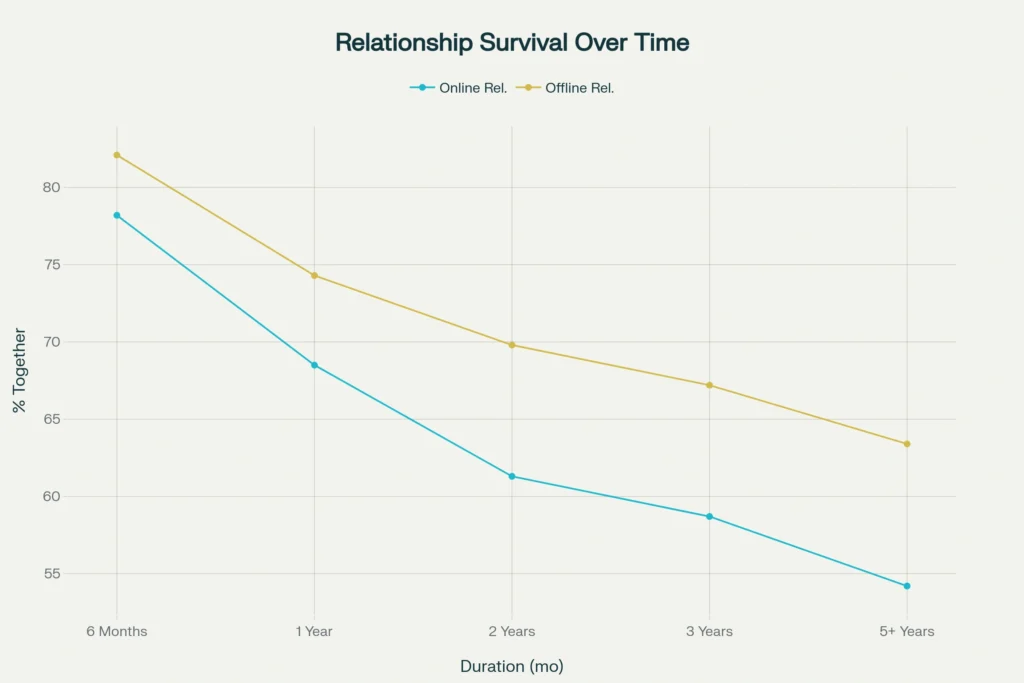 Divorce and separation rates: Online couples showed 5.96% breakdown rates versus 7.67% for offline couples; approximately 22% lower dissolution risk.